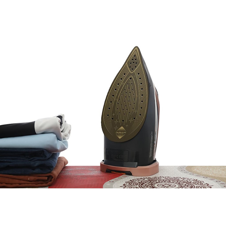 - Bàn ủi được trang bị mặt đế Ceramic Durilium AirGlide Autoclean cao cấp, giúp lướt êm trên bề mặt vải, chống dính, tránh trầy xước quần áo, chống bám cặn và bụi vải.