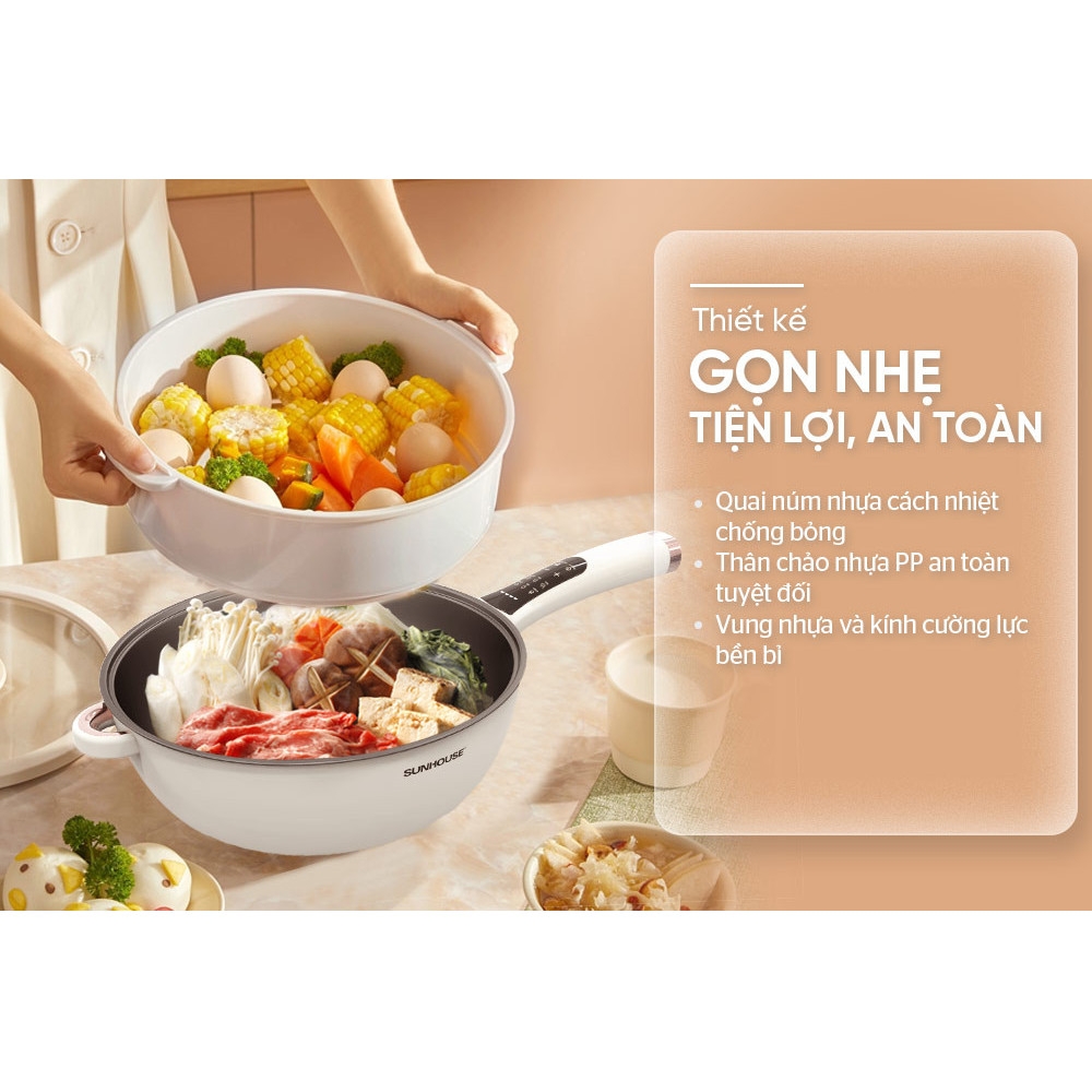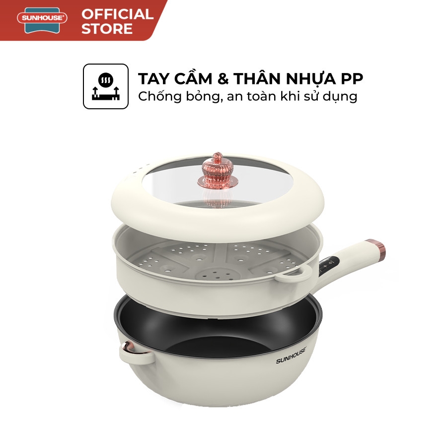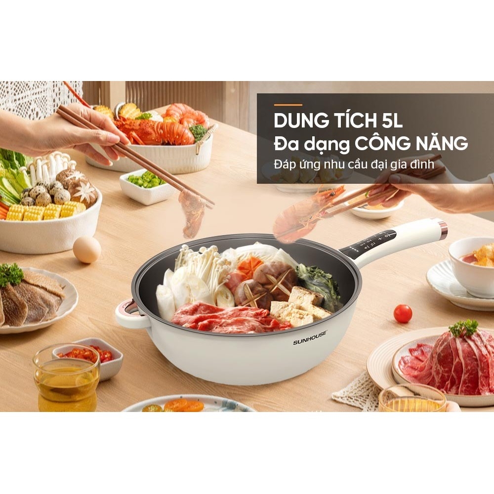 ĐẶC ĐIỂM NỔI BẬT· Đa chức năng: Chiên, Lẩu, Cháo, Xào, Hấp, Giữ ấm· Lòng nồi Inox chống dính cao cấp, dễ dàng vệ sinh· Điều khiển cảm ứng thông minh, dễ dàng sử dụng· Tay cầm và thân nhựa cách nhiệt, chống bỏng· Công suất lớn. nấu chín nhanh, không cần chờ đợi· Tự động ngắt khi quá nhiệt, an toàn tuyệt đốiMàu sắc: KemĐiện áp: 220 V~/50 HzCông suất: 1600 WDung tích: 5 LTrọng lượng: 2.2 kgChức năng: Chiên, Lẩu, Cháo, Xào, Hấp, Giữ ấmThân: Nhựa PPVung/nắp: Vung nhựa và kínhBảng điều khiển/Bộ điều chỉnh nhiệt: Cảm ứngHẹn giờ: CóKhóa trẻ em: KhôngThương hiệu: SUNHOUSEXuất xứ: Trung QuốcBảo hành: 12 thángĂn lẩu tại gia ngày càng trở nên quen thuộc với các gia đình Việt. Không những đổi vị bữa cơm gia đình, quây quần bên nồi lẩu còn là khoảng thời gian vàng để các thành viên thêm gắn kết. Thấu hiểu được nhu cầu đó, SUNHOUSE cho ra đời Chảo điện đa năng 5L SUNHOUSE SHD4555 với thiết kế trang nhã và công suất nấu mạnh mẽ, chế biến được nhiều loại thức ăn khác nhau, sử dụng đơn giản, tiện dụng hơn cho công việc nội trợ. KIỂU DÁNG TRANG NHÃ, GỌN NHẸ, DỄ SỬ DỤNGThiết kế trang nhã, gọn nhẹChảo điện đa năng 5L SUNHOUSE SHD4555 có thân nồi làm từ chất liệu nhựa PP cao cấp, bền bỉ, có khả năng chịu nhiệt cao. Đây cũng là chất liệu giúp hạn chế gây bỏng khi tiếp xúc với nồi, an toàn khi sử dụng. Gam màu kem trang nhã, lạ mắt là điểm nhấn thời thượng cho căn bếp gia đình.Vung chảo được làm bằng nhựa và kính chịu nhiệt, chất liệu trong suốt giúp quan sát được thức ăn bên trong nồi khi chế biến mà không cần mở vung, vô cùng tiện lợi. Núm vung, tay cầm bằng nhựa cách nhiệt chống bỏng tay giúp việc mở nắp và di chuyển dễ dàng, an toàn. Lòng nồi Inox phủ chống dính cao cấpLòng nồi được làm từ chất liệu INOX, cao cấp hơn hẳn các loại lòng nồi bằng chất liệu hợp kim nhôm thông thường, có hiệu quả truyền nhiệt cao hơn, giúp việc nấu nướng nhanh chóng, tiết kiệm thời gian và điện năng.Không những thế, lòng chảo còn được tráng một lớp chống dính cao cấp siêu bền, an toàn cho sức khỏe, không làm phát sinh chất độc hại khi tiếp xúc dưới nhiệt độ cao, tránh bám dính thức ăn, đặc biệt dễ dàng vệ sinh sau khi sử dụng. Điều khiển cảm ứng thông minhSản phẩm có nhiều mức nhiệt phù hợp với chức năng và mục đích nấu nướng khác nhau, được điều chỉnh bằng bảng điều khiển cảm ứng thông minh, tiện lợi. NẤU ĂN NGON HƠN, TIỆN LỢI VÀ NHANH CHÓNG HƠNChảo đa chức năngDung tích chảo lớn 5L phù hợp với đại gia đình trong những buổi liên hoan, họp mặt. Không chỉ nấu lẩu, nhờ lớp phủ chống dính, SUNHOUSE SHD4555 còn có thể dùng để xào, rán, hấp… rất tiện dụng, thay thế bếp gas tiện lợi, tiết kiệm năng lượng.Công suất lớn, nấu chín nhanhChảo điện đa năng 5L SUNHOUSE SHD4555 có một mâm nhiệt lớn giúp truyền nhiệt nhanh và đều, cùng công suất cao 1600W giúp nấu chín thức ăn nhanh chóng, tiết kiệm thời gian nấu nướng.Dễ dàng vệ sinhNhờ cấu tạo từ những vật liệu cao cấp, lòng nồi phủ chống dính nên việc vệ sinh, lau chùi rất đơn giản và nhẹ nhàng, không tốn sức.------------HAPOS HEL - ELMICH CHÍNH HÃNG------------