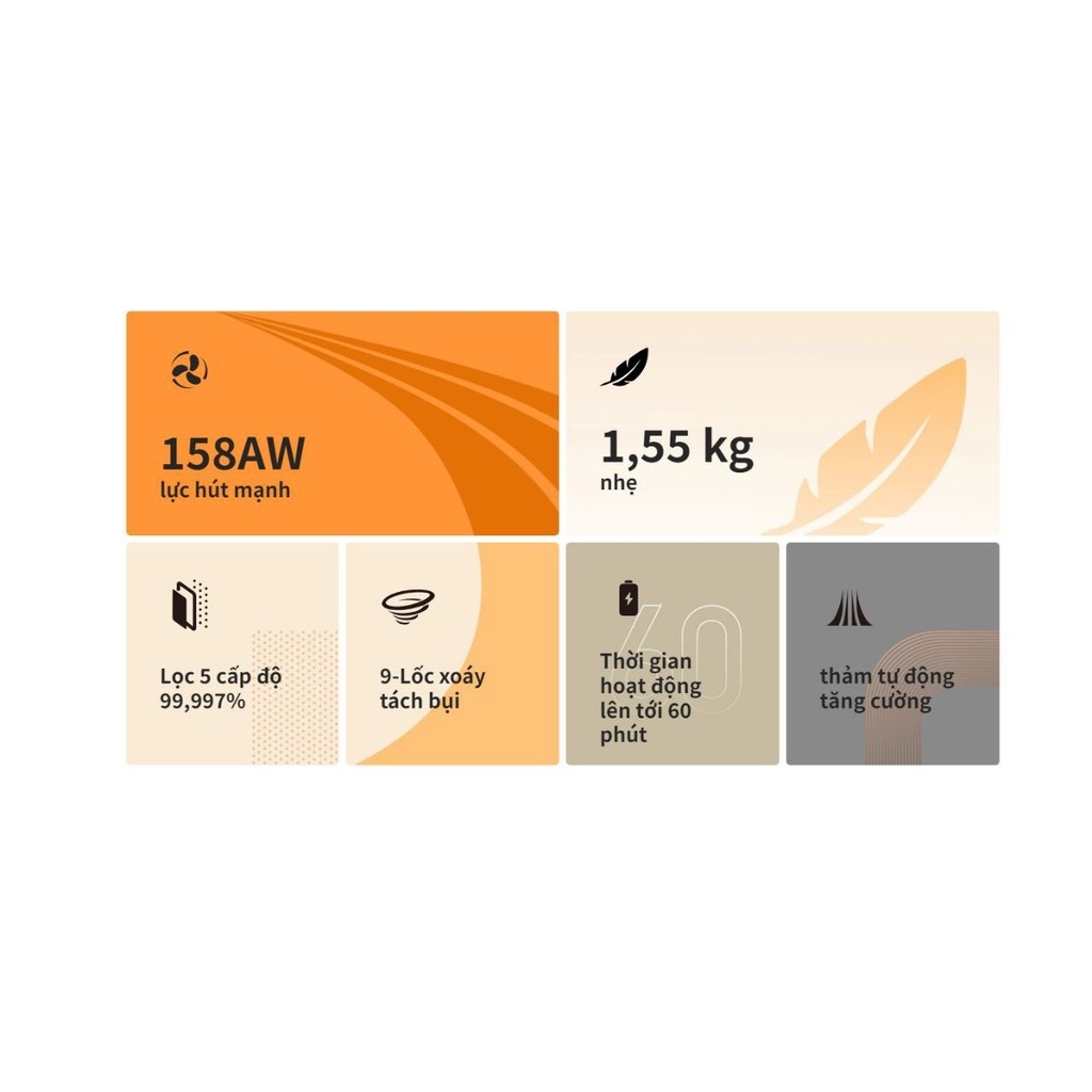 Roborock H5 là dòng máy hút bụi cầm tay không dây vừa được Roborock ra mắt vào tháng 7/2024. Đáp ứng đầy đủ dải sản phẩm từ máy hút bụi, máy lau nhà khô và ướt và robot hút bụi lau nhà cho khách hàng lựa chọn.Máy hút bụi cầm tay không dây Roborock H5 mang đến khả năng làm sạch vượt trội, Roborock H5 kết hợp khả năng hút mạnh mẽ với hệ thống lọc tiên tiến, tất cả trong một thiết kế mỏng và nhẹ, mang đến giải pháp làm sạch tiện lợi cho người dùng trên toàn thế giới. Được thiết kế hướng đến người dùng, Roborock H5 kết hợp tính di động với sức mạnh. Chỉ nặng 1,55KG và chỉ 1,82KG khi gắn thêm chổi mini có động cơ, máy hút bụi mang đến sự dễ sử dụng tối ưu. Người dùng có thể dễ dàng xử lý những điểm khó tiếp cận như kệ cao và góc trần nhà một cách chính xác. Thêm vào đó, với thời lượng pin mạnh mẽ cung cấp công suất làm sạch liên tục lên đến 60 phút, Roborock H5 đảm bảo chu trình làm sạch toàn diện mà không cần phải sạc lại thường xuyên, cung cấp nguồn điện không bị gián đoạn để bạn có thể làm sạch toàn bộ ngôi nhà của mình chỉ trong một lần. —- TÍNH NĂNG —-◉Công suất hút 158AW & động cơ 120000 vòng/phútMức công suất hút này cao hơn đáng kể so với máy hút bụi gia dụng thông thường.Nó mang lại hiệu suất làm sạch đặc biệt trên nhiều bề mặt, hút được lông thú cưng, bụi mịn và mảnh vụn.Nó lý tưởng cho các môi trường cần vệ sinh sâu, chẳng hạn như nhà có nuôi thú cưng, thảm dày hoặc diện tích lớn.◉Lọc tiên tiếnHệ thống tách bụi 9 lốc xoáy tiên tiến và hệ thống lọc 5 giai đoạn với bộ lọc HEPA để thu giữ 99,997% các hạt nhỏ tới 0,3 micron, chúng nổi tiếng với khả năng loại bỏ hiệu quả các chất gây dị ứng thông thường, phấn hoa, lông thú cưng, bào tử nấm mốc, hạt khói, vi-rút và vi khuẩn.Túi đựng bụi kháng khuẩn, tự động đóng kín và có cửa sổ trong suốt, dễ tháo rời và lý tưởng cho những người nhạy cảm hoặc dễ bị dị ứng.◉Phụ kiện đa năngMột bàn chải chính thích ứng cho sàn gỗ cứng và thảm, một bàn chải mini có động cơ để vệ sinh sâu và một dụng cụ khe hở 2 trong 1 cho không gian chật hẹp, đảm bảo vệ sinh kỹ lưỡng và hiệu quả.—- THÔNG SỐ KỸ THUẬT —-◉Kích thước sản phẩm:1135*250*243 mm◉Trọng lượng tịnh (Thân máy hút bụi): 1,55 kg◉Trọng lượng tịnh (có chổi mini có động cơ): 1,82kg◉Dung tích túi đựng bụi:560ml (Thay túi dùng một lần sau mỗi 1 tháng)◉Công suất hút (Tối đa): 158 AW◉Âm lượng tiếng ồn:69dB◉Thời gian sạc:Xấp xỉ. 3,5 giờ◉Chổi vệ sinh: Chổi đa bề mặt, Chổi mini có động cơ, Chổi khe hở 2 trong 1◉Thời gian chạy với Chổi khe hở 2 trong 1 (Chế độ tiêu chuẩn 32 phút, Chế độ tối đa 12 phút, Chế độ tiết kiệm 60 phút)◉Thời gian chạy với Chổi đa bề mặt (Chế độ tiêu chuẩn 30 phút, Chế độ tối đa 10 phút, Chế độ tiết kiệm 55 phút)◉Thời gian chạy với Chổi mini có động cơ (Chế độ tiêu chuẩn 30 phút, Chế độ tối đa 10 phút, Chế độ tiết kiệm 55 phút)◉Thông minhHệ thống lọc 5 giai đoạn (Bộ lọc HEPA)Hệ thống phân tách bụi 9 lốc xoáyVệ sinh thông minh thích ứng#cheapmall
