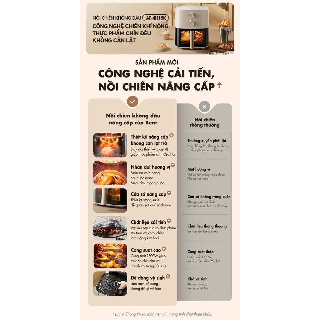 **Ghi chú: Tất cả sản phẩm nồi chiên không dầu chỉ có khả năng chịu nhiệt, KHÔNG CÁCH NHIỆT, nhiệt lượng tỏa ra trong quá trình nấu vẫn sẽ làm nhiệt độ bên ngoài nồi nóng lên