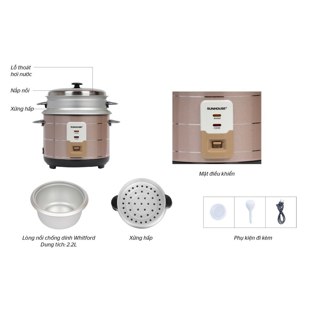Nồi cơm điện nắp rời Sunhouse SHD8135, 900W, 2.2 Lít - HAPOS HEL SHD8135