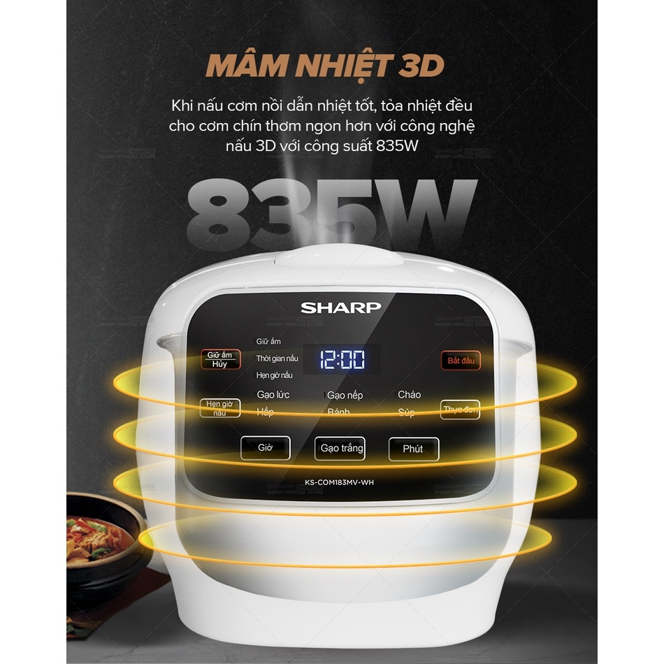 Nồi Cơm Điện Sharp KS-COM183MV-WH 1.8L [Đa Năng, Công Suất 835W, Chống Dính] KS-COM183MV - KS-COM183MV