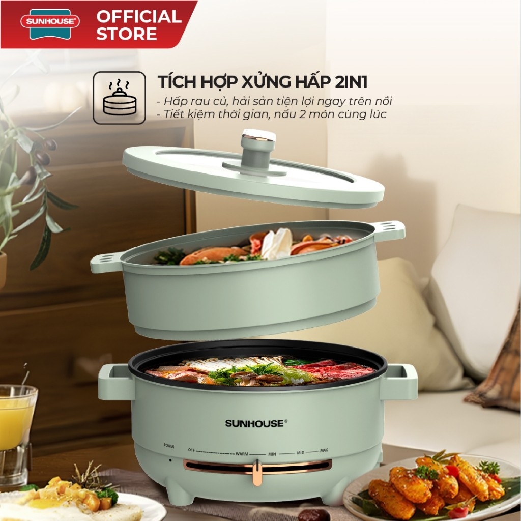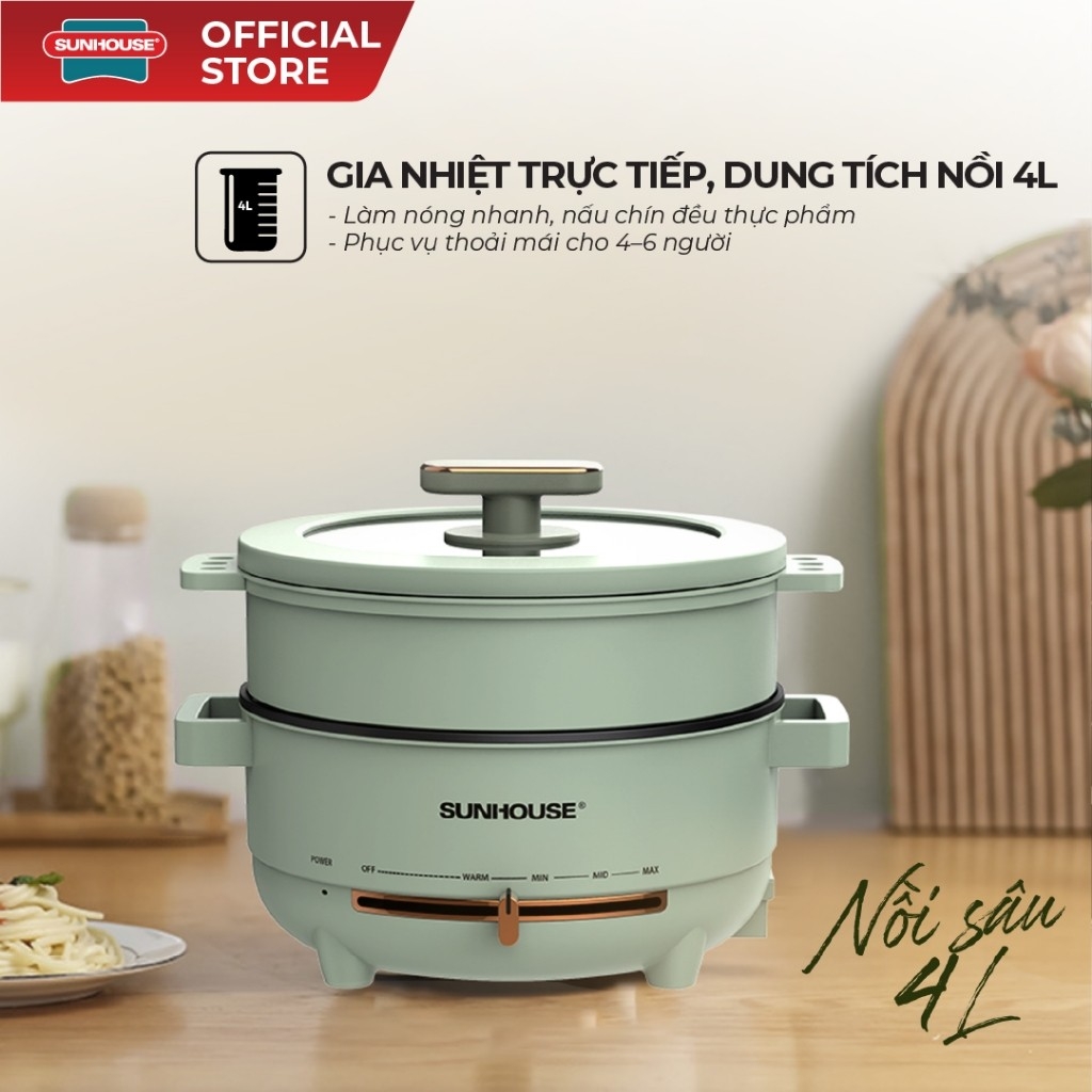 Nồi lẩu điện đa năng 4L Sunhouse SHD4540 có xửng hấp - Gia nhiệt trực tiếp - Chống dính PTFE - HAPOS HEL SHD4540